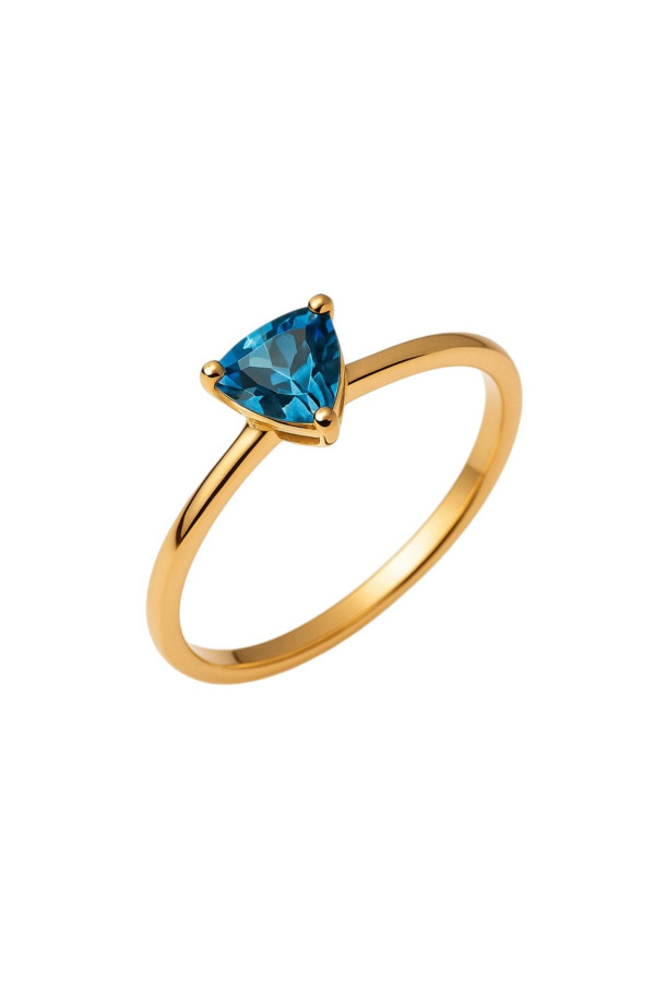 This rose gold ring features a vivid triangle-cut blue topaz, set in a minimalist frame that highlights the gemstone’s brilliance and shape. With its sleek band and contemporary design, the ring is perfect for those who appreciate modern elegance and unique accents in everyday or statement jewelry.
