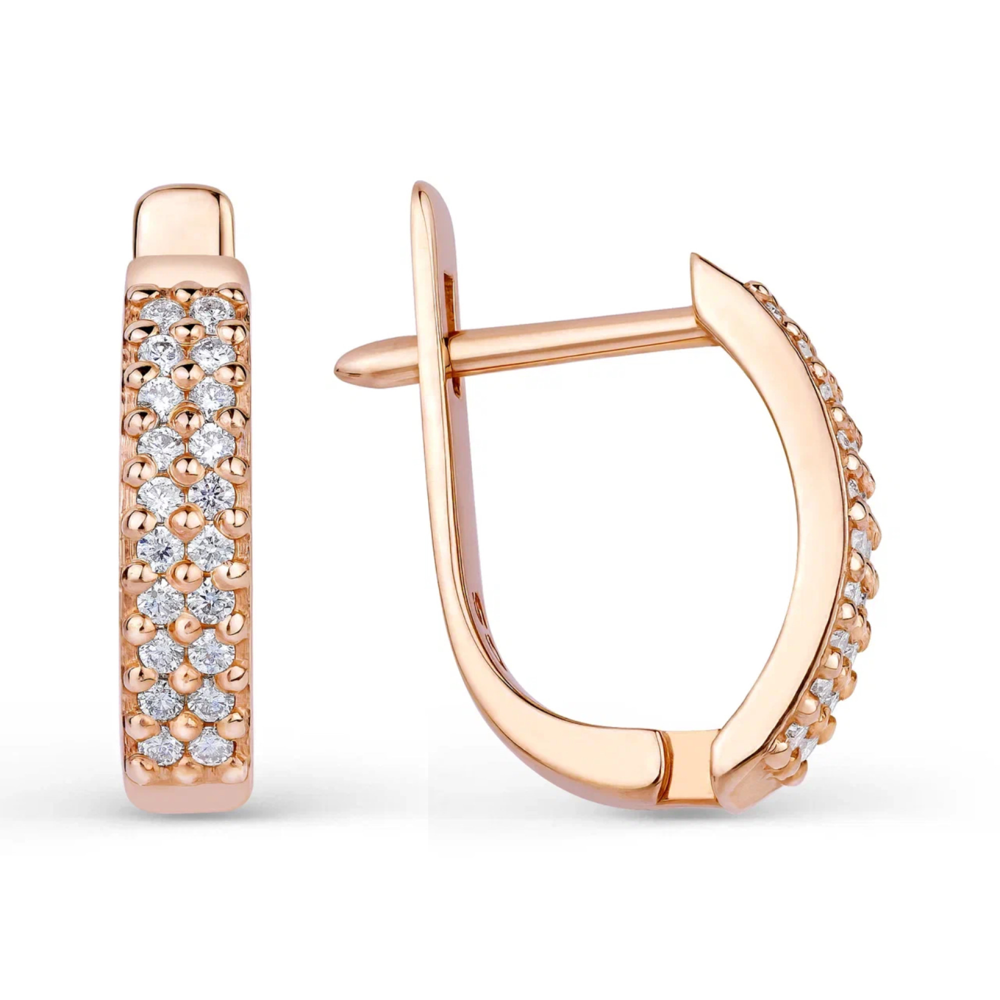 Серьги — это сочетание классики и утончённого блеска. Выполненные из благородного розового золота, они украшены двумя ровными рядами сверкающих бриллиантов. Такой дизайн придаёт образу изысканность и уверенный стиль. Серьги станут отличным акцентом в повседневном гардеробе и элегантным дополнением вечернего наряда. Прекрасный выбор для тех, кто ценит сдержанную роскошь.