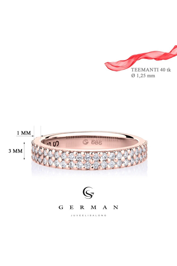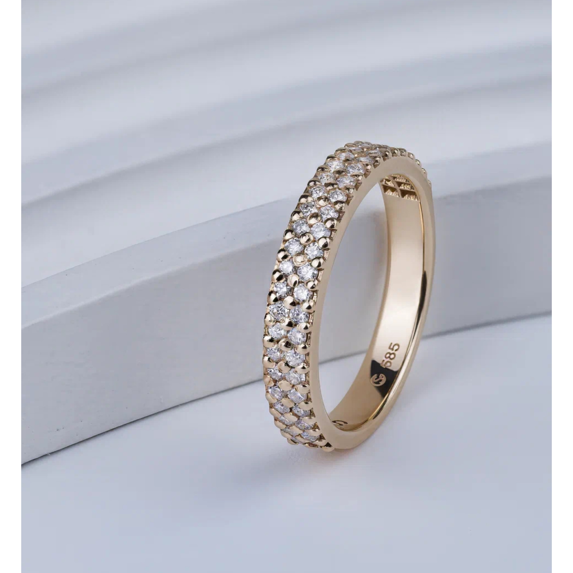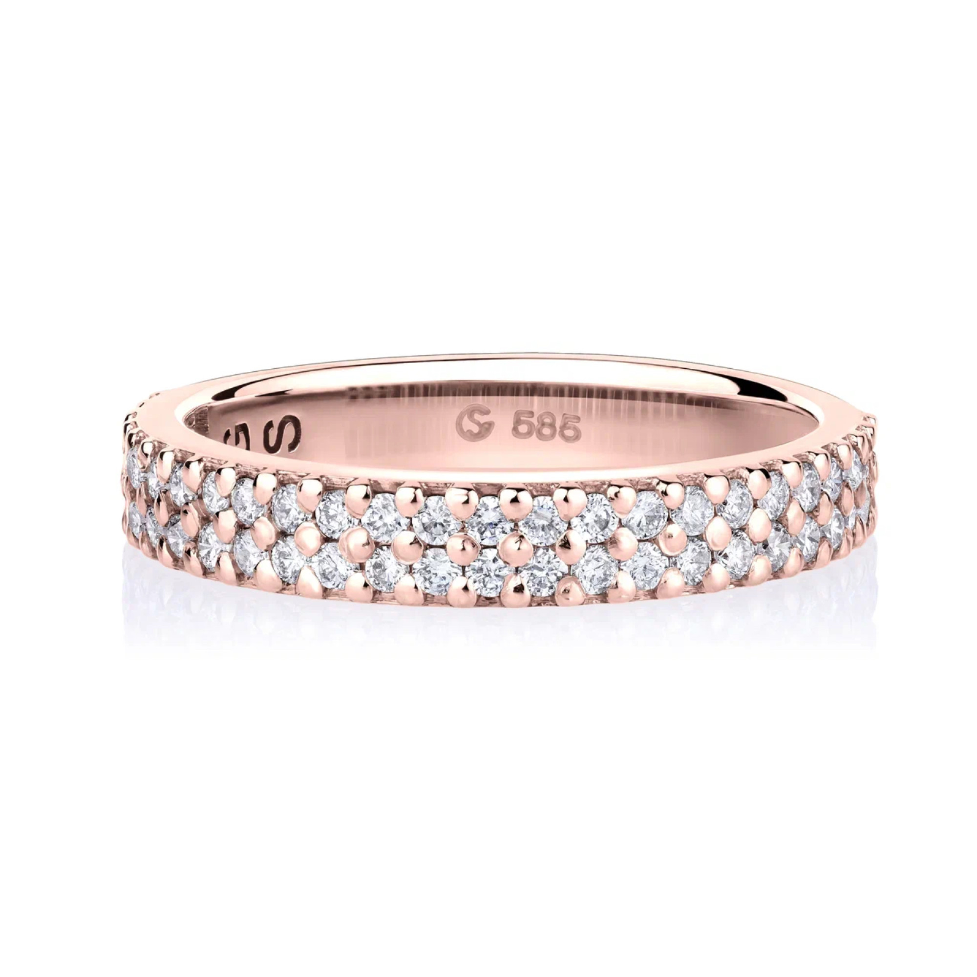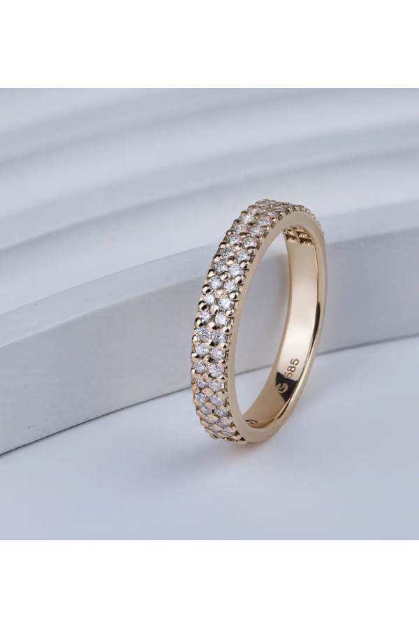 Кольцо — это воплощение сияния и утончённой роскоши. Выполненное из розового золота, оно инкрустировано бриллиантами общим весом 0,45 Ct, выложенными в два идеально ровных ряда. Такой дизайн создаёт эффект непрерывного мерцания и подойдёт как для торжественных случаев, так и для повседневного образа. Кольцо станет идеальным подарком и элегантным акцентом в любой ювелирной коллекции.