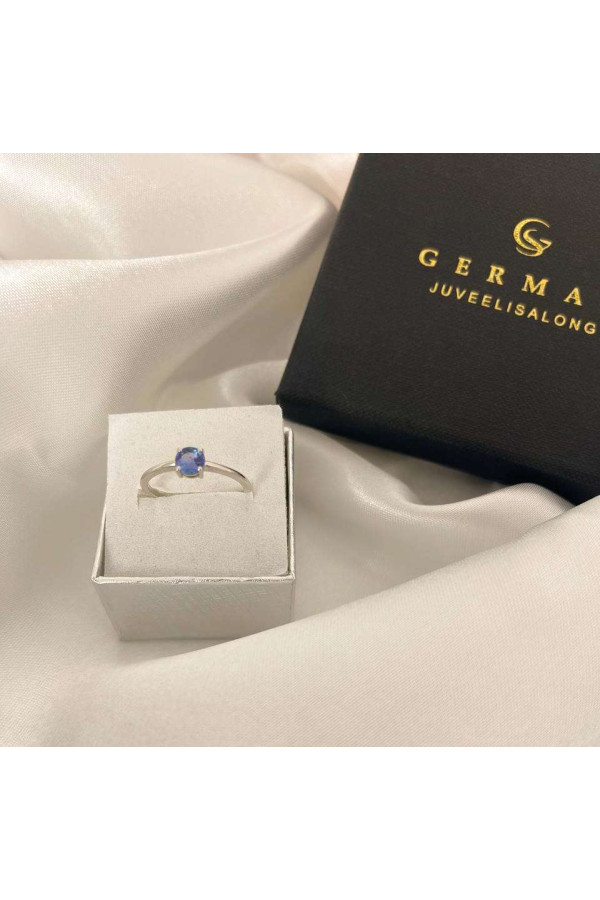 See valgekuldne sõrmus on kaunistatud loodusliku sügavlilla-sinise tansaniidiga, mis on kinnitatud klassikalise nelja krapiga. Minimalistlik vorm toob esile kivi ilu ning sobib kandmiseks nii igapäevaselt kui ka pidulikel hetkedel.
