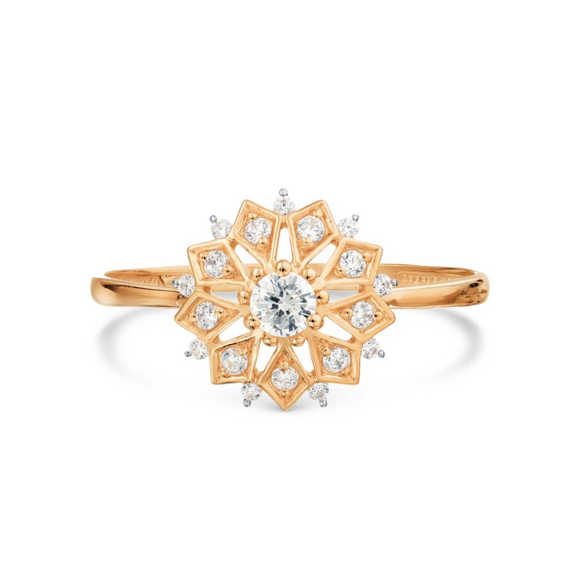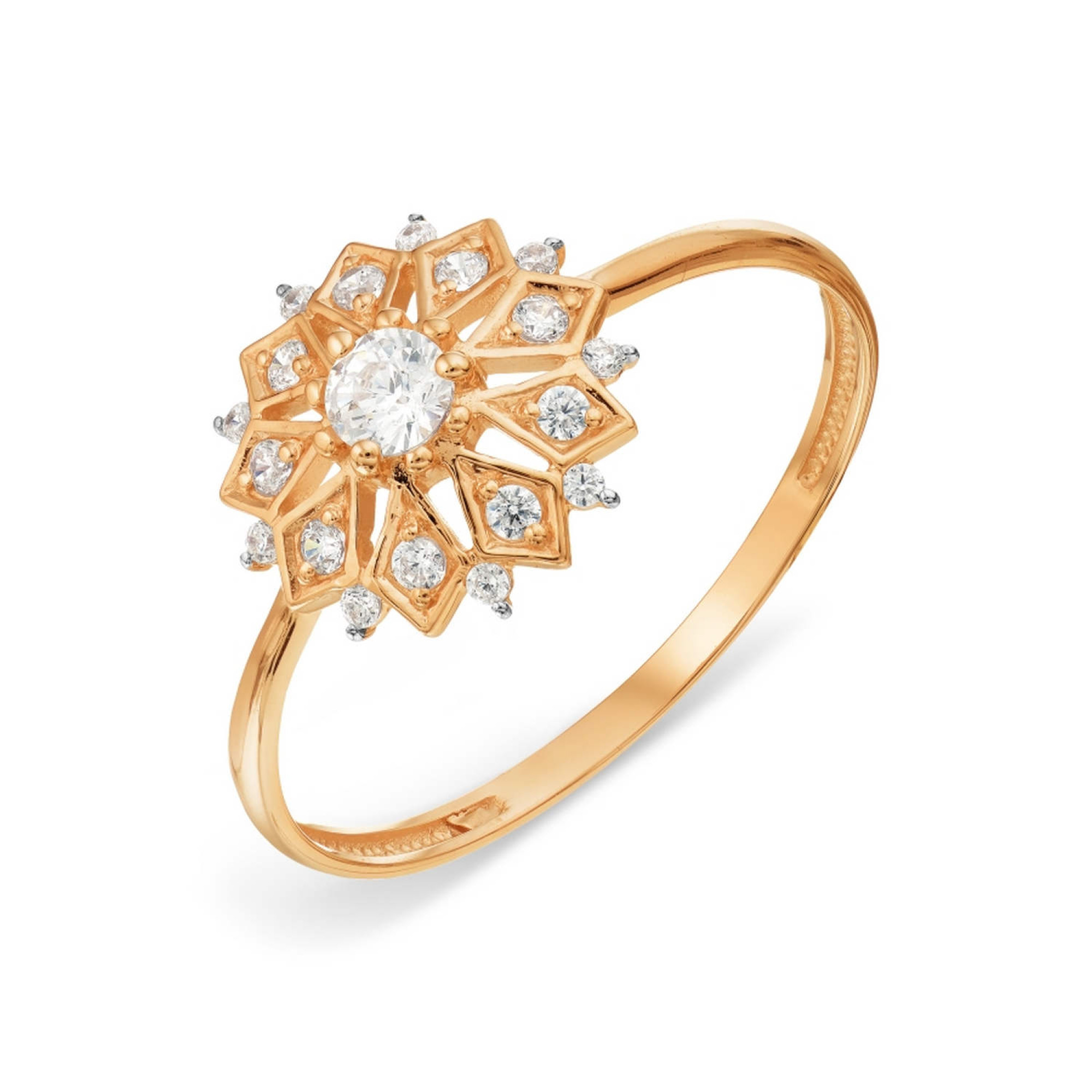 Kuldsõrmus tsirkooniumoksiidiga: 16,5. Elegantne sõrmus 585 punasest kullast. Toote kaal 1,21 g, suurus 16,5